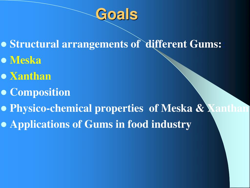 Goals • Structural arrangements of different Gums:: • Meska • Xanthan • Composition • Physico-chemical properties of Meska & Xanthan • Applications of Gums in food industry
