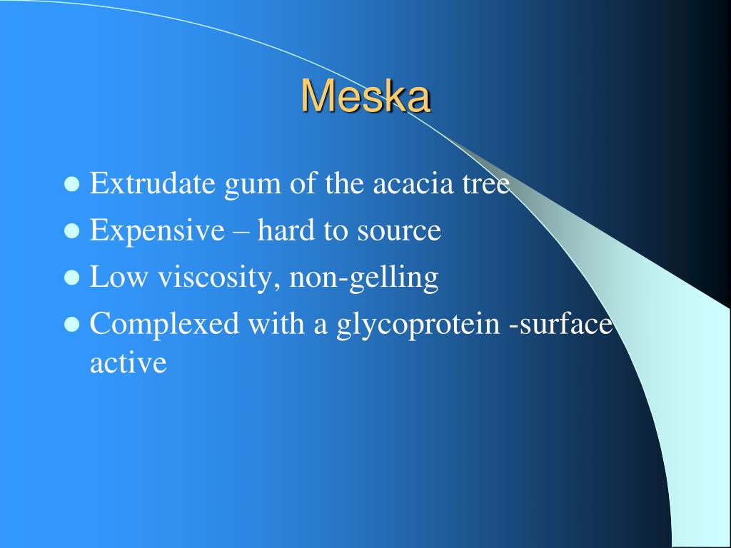 Meska • Extrudate gum of the acacia tree • Expensive – hard to source • Low viscosity, non-gelling • Complexed with a glycoprotein -surface active