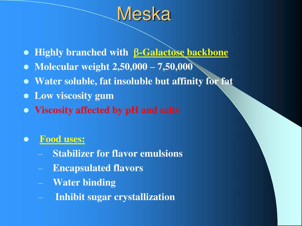 Meska • Highly branched with b-Galactose backbone • Molecular weight 2,50,000 – 7,50,000 • Water soluble, fat insoluble but affinity for fat • Low viscosity gum • Viscosity affected by pH and salts • Food uses: • Stabilizer for flavor emulsions • Encapsulated flavors • Water binding • Inhibit sugar crystallization