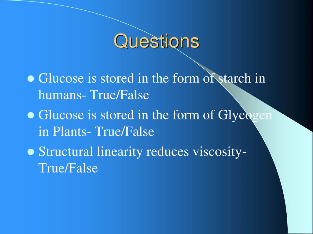 Questions Glucose is stored in the form of starch in humans- True/False Glucose is stored in the form of Glycogen in Plants- True/False Structural linearity reduces viscosity- True/False