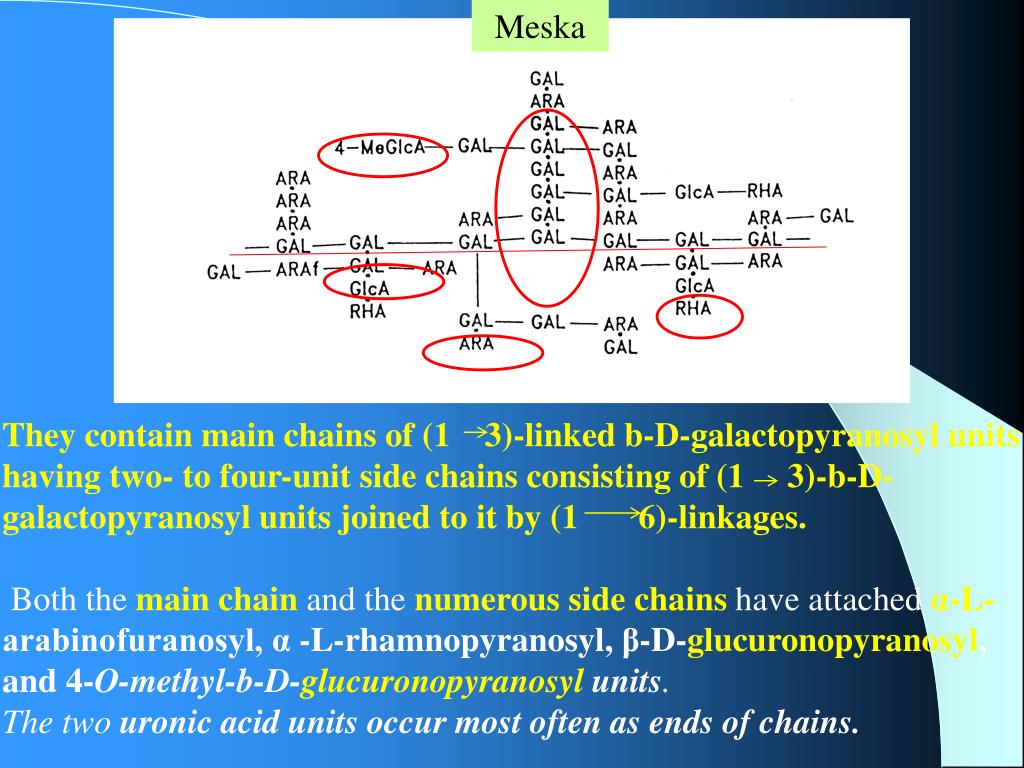 Meska They contain main chains of (1 3)-linked b-D-galactopyranosyl units having two- to four-unit side chains consisting of (1 3)-b-D-galactopyranosyl units joined to it by (1 6)-linkages. Both the main chain and the numerous side chains have attached α-L-arabinofuranosyl, α -L-rhamnopyranosyl, β-D-glucuronopyranosyl, and 4-O-methyl-b-D-glucuronopyranosyl units. The two uronic acid units occur most often as ends of chains.