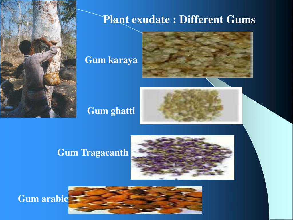 Plant exudate : Different Gums Gum karaya Gum ghatti Gum Tragacanth Gum arabic