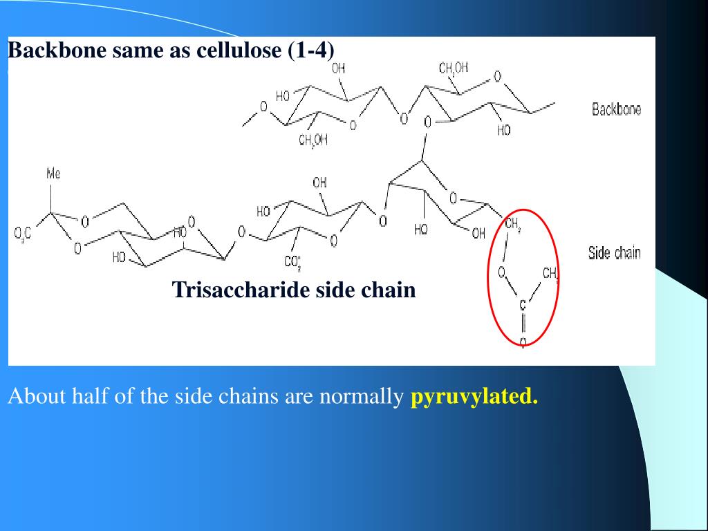Backbone same as cellulose (1-4) Glucose) Trisaccharide side chain About half of the side chains are normally pyruvylated.