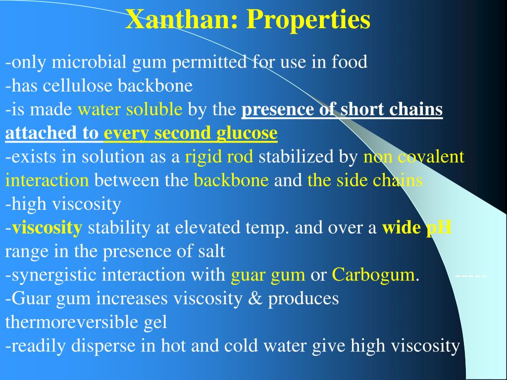 Xanthan: Properties -only microbial gum permitted for use in food -has cellulose backbone -is made water soluble by the presence of short chains attached to every second glucose -exists in solution as a rigid rod stabilized by non covalent interaction between the backbone and the side chains -high viscosity -viscosity stability at elevated temp. and over a wide pH range in the presence of salt -synergistic interaction with guar gum or Carbogum. ------Guar gum increases viscosity & produces thermoreversible gel -readily disperse in hot and cold water give high viscosity