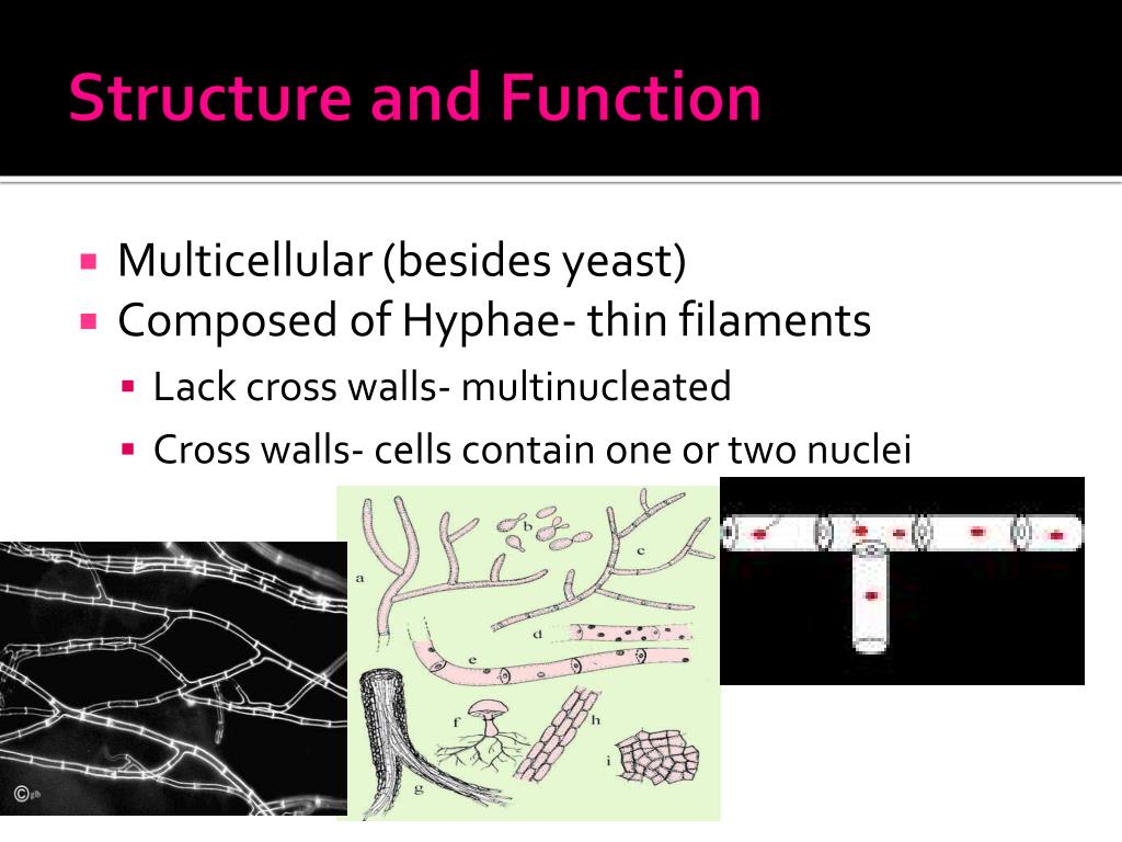Structure and Function • Multicellular (besides yeast) • Composed of Hyphae- thin filaments • Lack cross walls- multinucleated • Cross walls- cells contain one or two nuclei