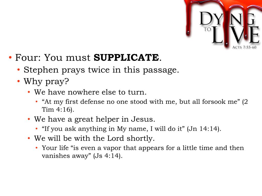 Four: You must SUPPLICATE. • Stephen prays twice in this passage. • Why pray? • We have nowhere else to turn. • “At my first defense no one stood with me, but all forsook me” (2 Tim 4:16). • We have a great helper in Jesus. • “If you ask anything in My name, I will do it” (Jn 14:14). • We will be with the Lord shortly. • Your life “is even a vapor that appears for a little time and then vanishes away” (Js 4:14).