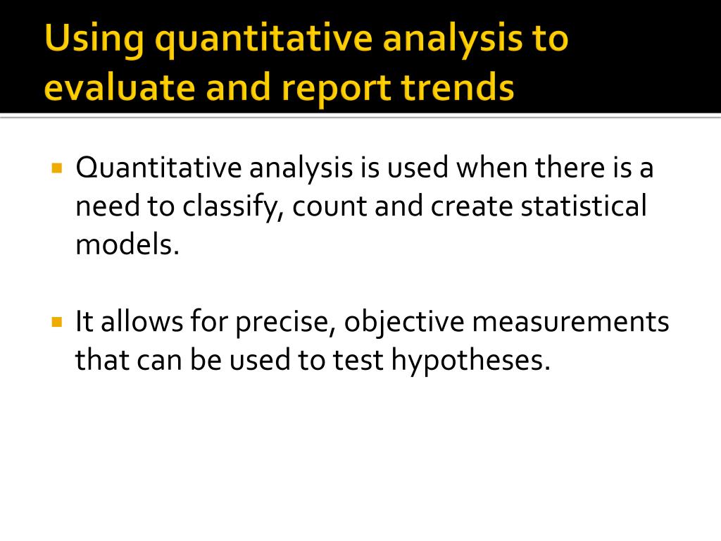 Using quantitative analysis to evaluate and report trends • Quantitative analysis is used when there is a need to classify, count and create statistical models. • It allows for precise, objective measurements that can be used to test hypotheses.