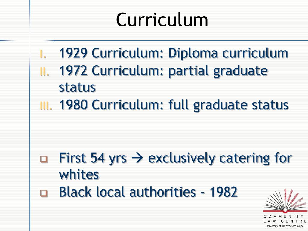 Curriculum • 1929 Curriculum: Diploma curriculum • 1972 Curriculum: partial graduate status • 1980 Curriculum: full graduate status • First 54 yrs exclusively catering for whites • Black local authorities - 1982
