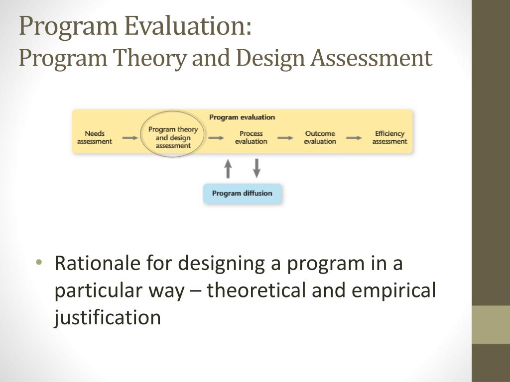 Program Evaluation: Program Theory and Design Assessment • Rationale for designing a program in a particular way – theoretical and empirical justification