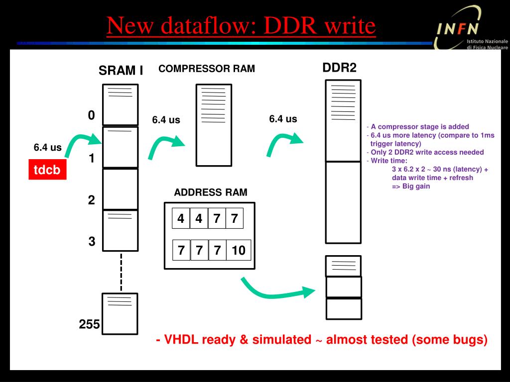 New dataflow: DDR write DDR2 ADDRESS RAM SRAM I COMPRESSOR RAM 4 4 7 7 0 6.4 us 6.4 us • A compressor stage is added • 6.4 us more latency (compare to 1ms trigger latency) • Only 2 DDR2 write access needed • Write time: • 3 x 6.2 x 2 ~ 30 ns (latency) + • data write time + refresh • => Big gain 7 7 7 10 6.4 us 1 tdcb 2 3 255 - VHDL ready & simulated ~ almost tested (some bugs)