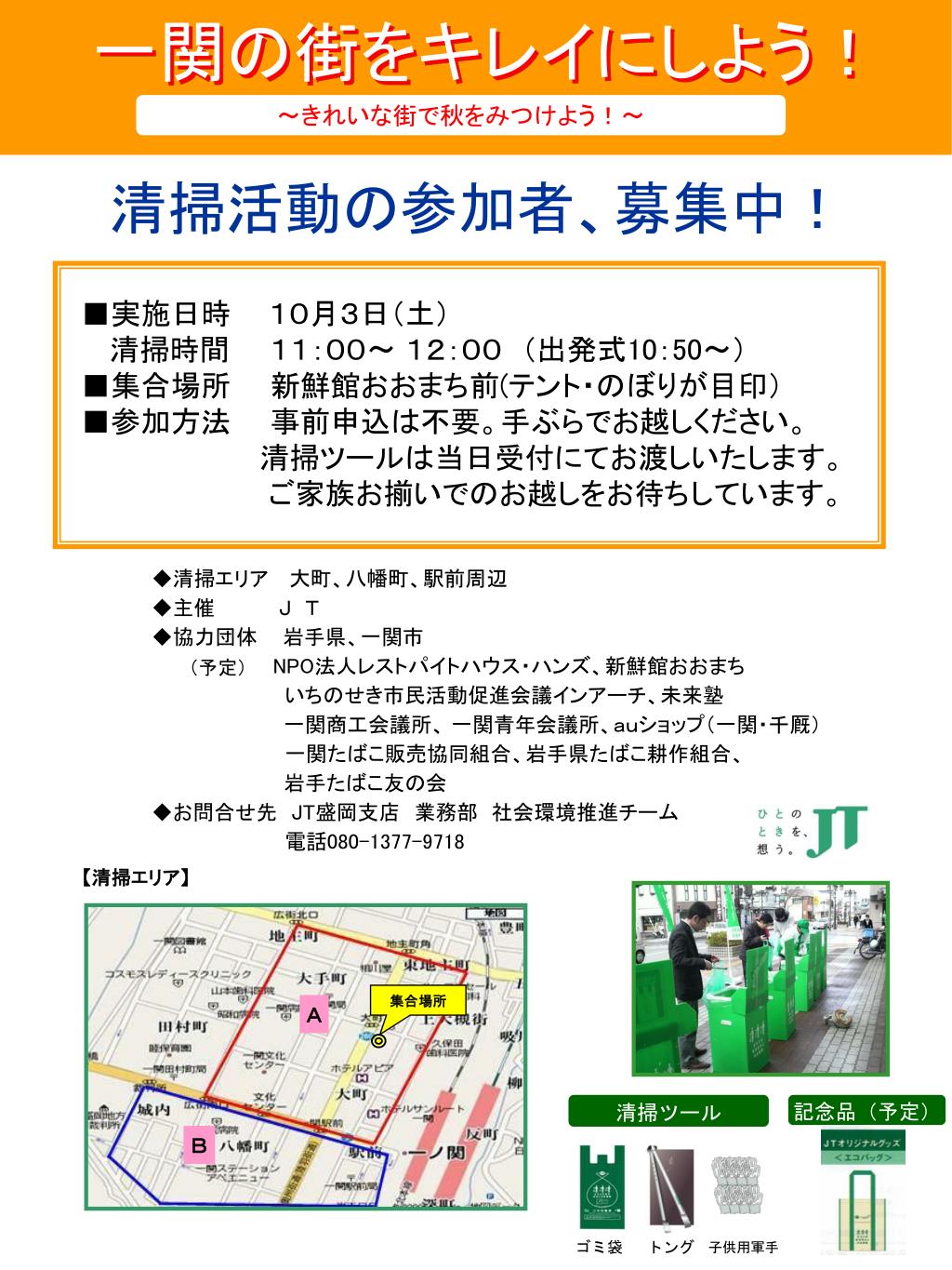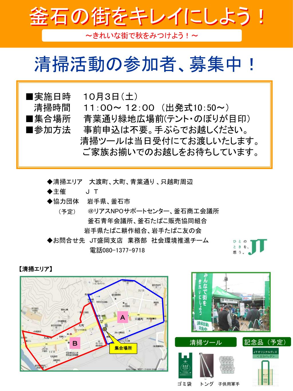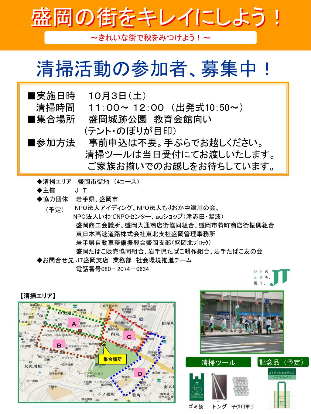 盛岡の街をキレイにしよう!. ゴミ袋 . ~きれいな街で秋をみつけよう!~. 清掃活動の参加者、募集中!. ■ 実施日時 10月3日(土) 清掃時間 11:00~ 12:00 (出発式 10 : 50 ~) ■集合場所 盛岡城跡公園 教育会館向い ( テント・のぼりが目印) ■参加方法 事前申込は不要。手ぶらでお越しください。 清掃ツールは当日受付にてお渡しいたします。 ご家族お揃いでのお越しをお待ちしています。. ◆ 清掃エリア 盛岡市街地 ( 4 コース) ◆主催 J T