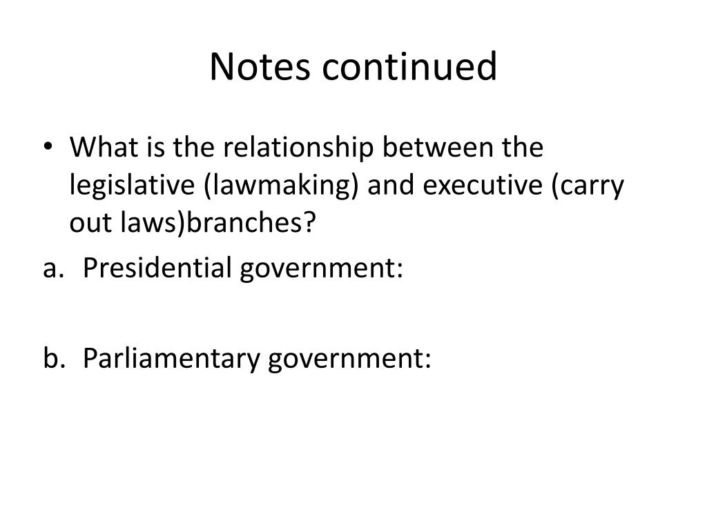 Notes continued • What is the relationship between the legislative (lawmaking) and executive (carry out laws)branches? • Presidential government: • Parliamentary government: