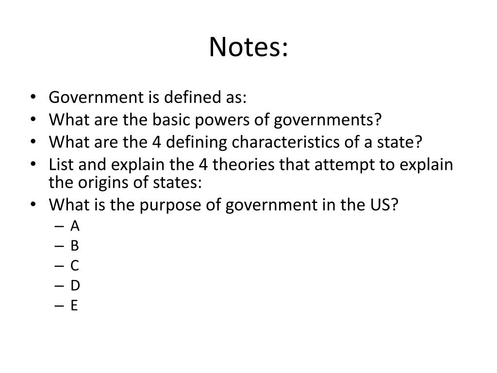 Notes: • Government is defined as: • What are the basic powers of governments? • What are the 4 defining characteristics of a state? • List and explain the 4 theories that attempt to explain the origins of states: • What is the purpose of government in the US? • A • B • C • D • E