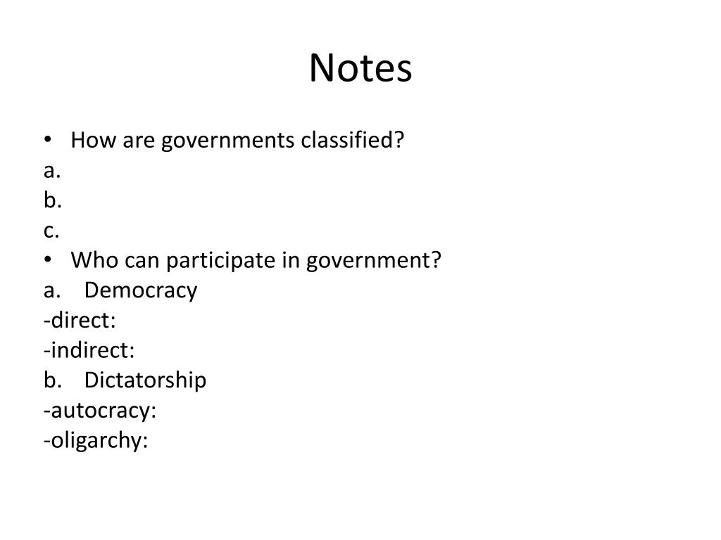 Notes • How are governments classified? a. b. c. • Who can participate in government? • Democracy -direct: -indirect: • Dictatorship -autocracy: -oligarchy: