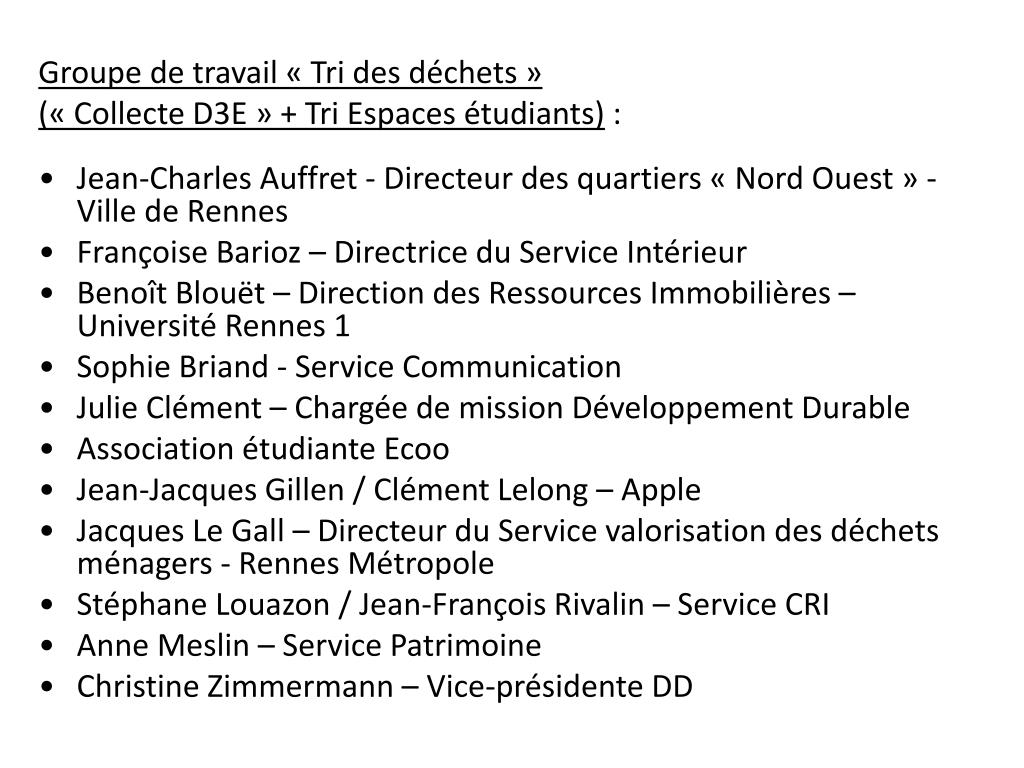 Groupe de travail « Tri des déchets » (« Collecte D3E » + Tri Espaces étudiants) : • Jean-Charles Auffret - Directeur des quartiers « Nord Ouest » - Ville de Rennes • Françoise Barioz – Directrice du Service Intérieur • Benoît Blouët – Direction des Ressources Immobilières – Université Rennes 1 • Sophie Briand - Service Communication • Julie Clément – Chargée de mission Développement Durable • Association étudiante Ecoo • Jean-Jacques Gillen / Clément Lelong – Apple • Jacques Le Gall – Directeur du Service valorisation des déchets ménagers - Rennes Métropole • Stéphane Louazon / Jean-François Rivalin – Service CRI • Anne Meslin – Service Patrimoine • Christine Zimmermann – Vice-présidente DD