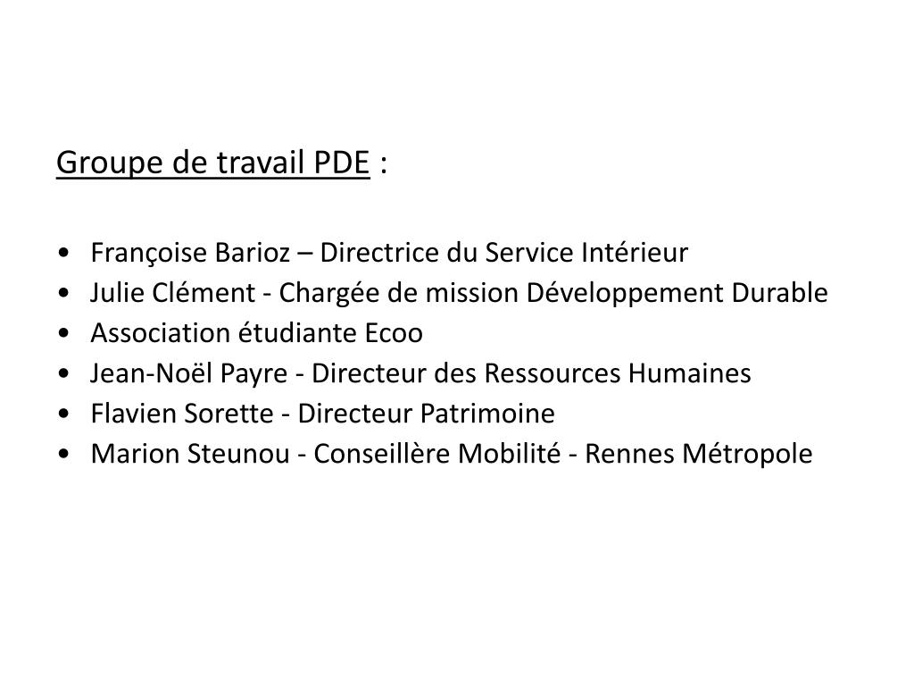 Groupe de travail PDE : • Françoise Barioz – Directrice du Service Intérieur • Julie Clément - Chargée de mission Développement Durable • Association étudiante Ecoo • Jean-Noël Payre - Directeur des Ressources Humaines • Flavien Sorette - Directeur Patrimoine • Marion Steunou - Conseillère Mobilité - Rennes Métropole