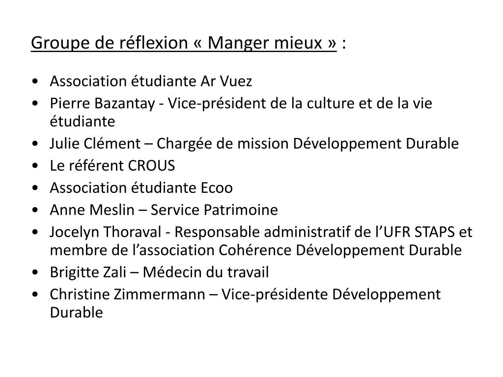 Groupe de réflexion « Manger mieux » : • Association étudiante Ar Vuez • Pierre Bazantay - Vice-président de la culture et de la vie étudiante • Julie Clément – Chargée de mission Développement Durable • Le référent CROUS • Association étudiante Ecoo • Anne Meslin – Service Patrimoine • Jocelyn Thoraval - Responsable administratif de l’UFR STAPS et membre de l’association Cohérence Développement Durable • Brigitte Zali – Médecin du travail • Christine Zimmermann – Vice-présidente Développement Durable