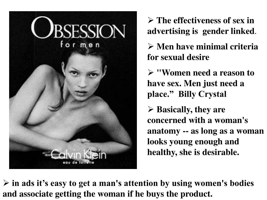 The effectiveness of sex in advertising is gender linked. • Men have minimal criteria for sexual desire • "Women need a reason to have sex. Men just need a place.” Billy Crystal • Basically, they are concerned with a woman's anatomy -- as long as a woman looks young enough and healthy, she is desirable. • in ads it’s easy to get a man's attention by using women's bodies and associate getting the woman if he buys the product.