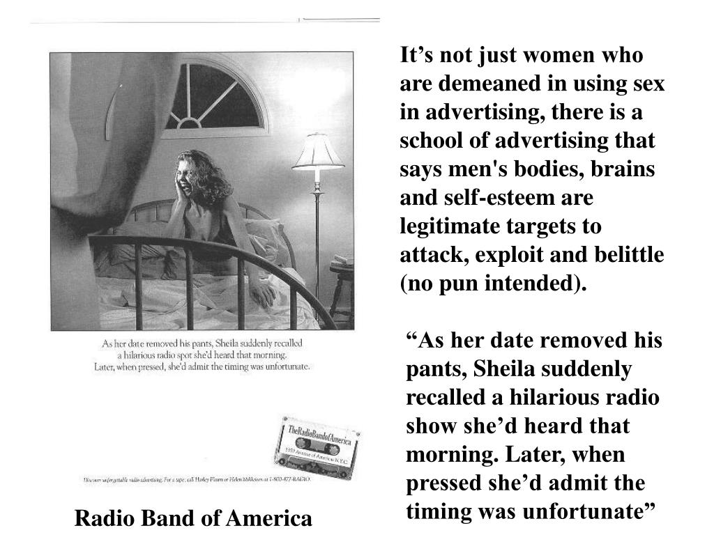 It’s not just women who are demeaned in using sex in advertising, there is a school of advertising that says men's bodies, brains and self-esteem are legitimate targets to attack, exploit and belittle (no pun intended). “As her date removed his pants, Sheila suddenly recalled a hilarious radio show she’d heard that morning. Later, when pressed she’d admit the timing was unfortunate” Radio Band of America