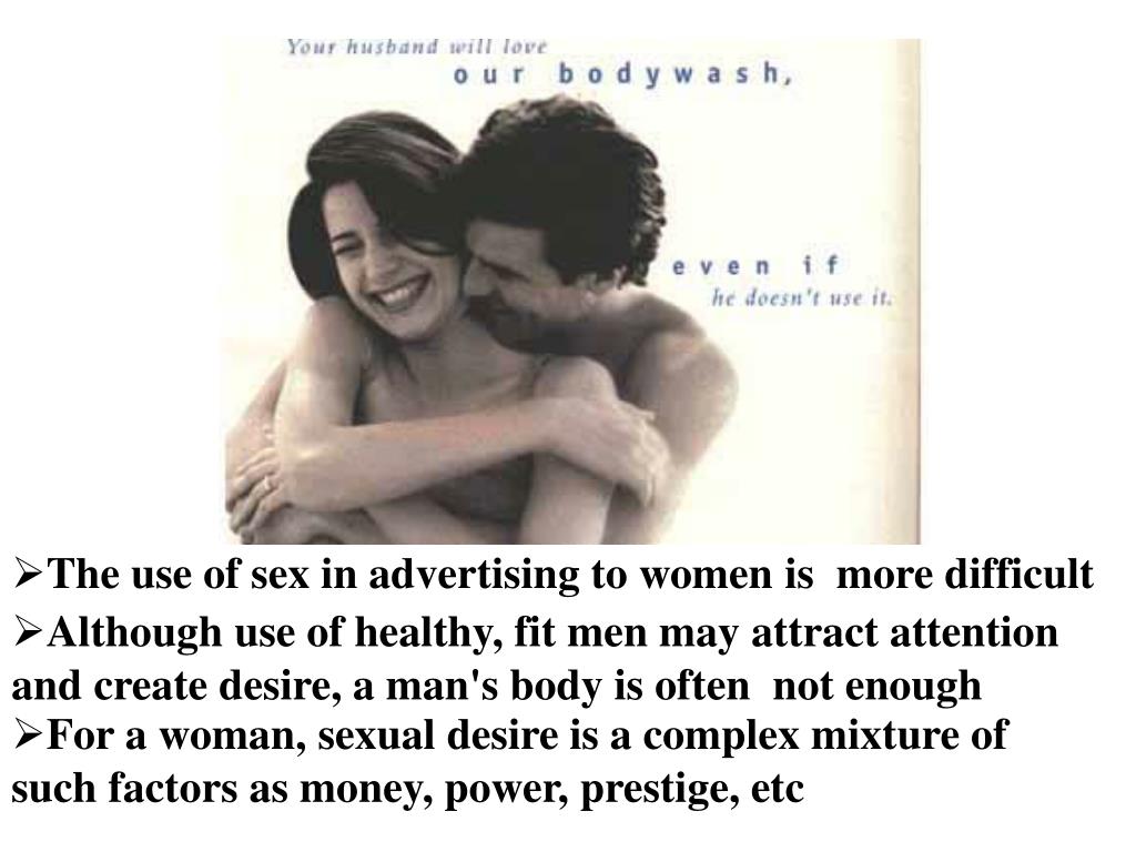 The use of sex in advertising to women is more difficult • Although use of healthy, fit men may attract attention and create desire, a man's body is often not enough • For a woman, sexual desire is a complex mixture of such factors as money, power, prestige, etc