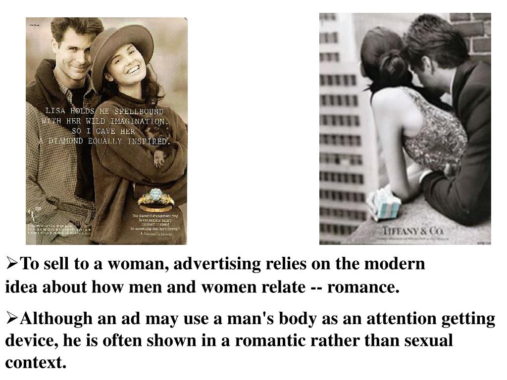 To sell to a woman, advertising relies on the modern idea about how men and women relate -- romance. • Although an ad may use a man's body as an attention getting device, he is often shown in a romantic rather than sexual context.