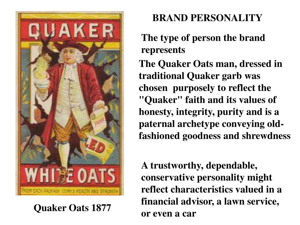 BRAND PERSONALITY The type of person the brand represents The Quaker Oats man, dressed in traditional Quaker garb was chosen purposely to reflect the "Quaker" faith and its values of honesty, integrity, purityandis a paternal archetype conveying old-fashioned goodness and shrewdness A trustworthy, dependable, conservative personality might reflect characteristics valued in a financial advisor, a lawn service, or even a car Quaker Oats 1877