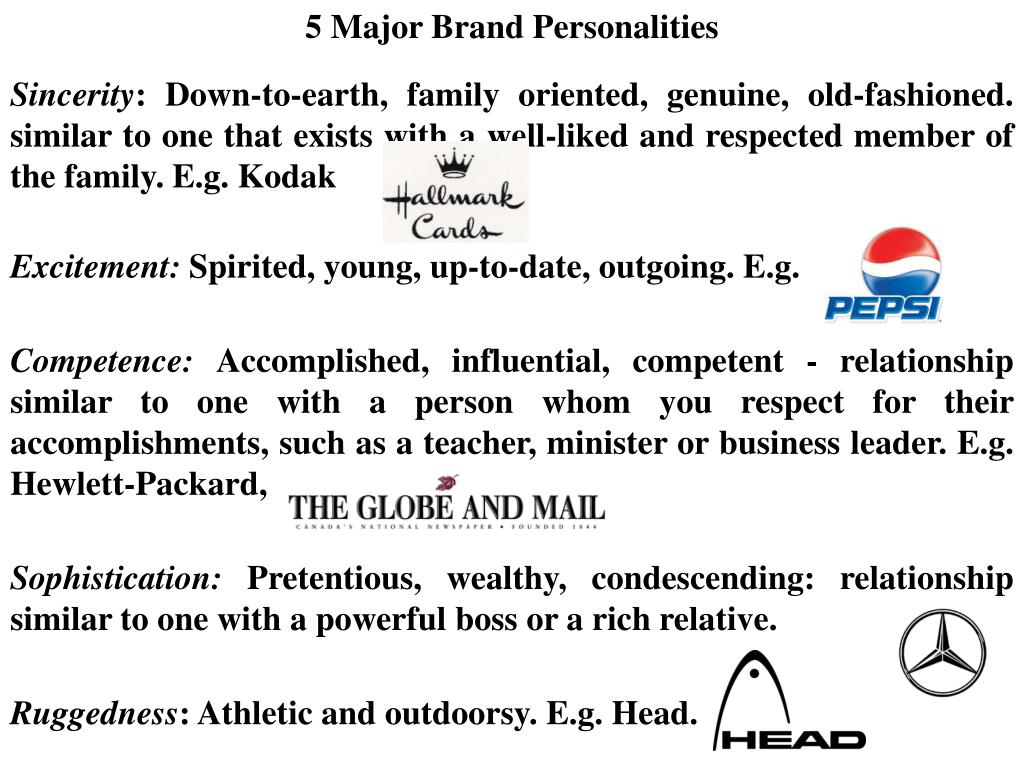 5 Major Brand Personalities Sincerity: Down-to-earth, family oriented, genuine, old-fashioned. similar to one that exists with a well-liked and respected member of the family. E.g. Kodak Excitement: Spirited, young, up-to-date, outgoing. E.g. Competence: Accomplished, influential, competent - relationship similar to one with a person whom you respect for their accomplishments, such as a teacher, minister or business leader. E.g. Hewlett-Packard, Sophistication: Pretentious, wealthy, condescending: relationship similar to one with a powerful boss or a rich relative. Ruggedness: Athletic and outdoorsy. E.g. Head.
