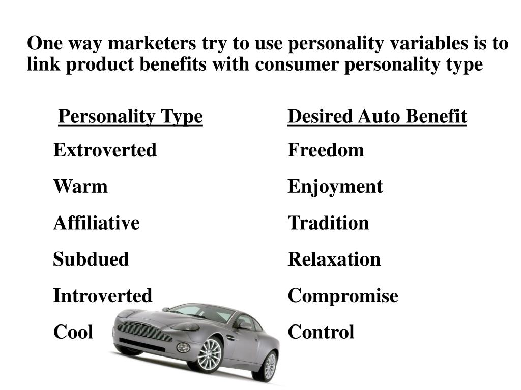 One way marketers try to use personality variables is to link product benefits with consumer personality type • Personality TypeDesired Auto Benefit Extroverted Warm Affiliative Subdued Introverted Cool Freedom Enjoyment Tradition Relaxation Compromise Control