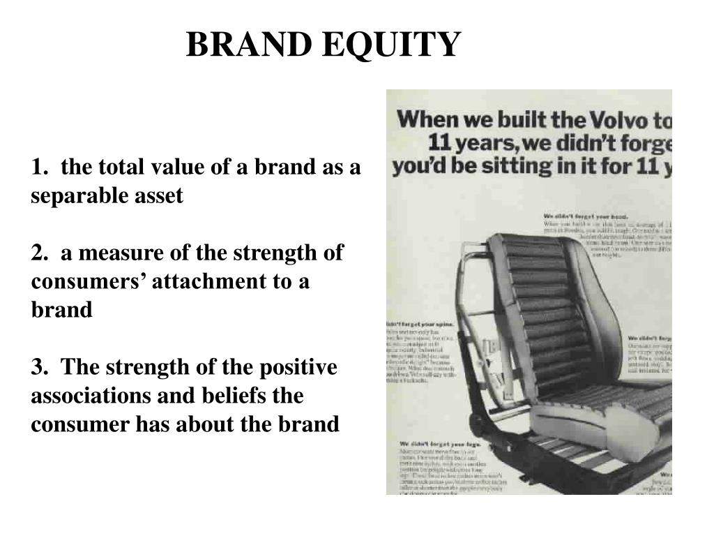 BRAND EQUITY 1. the total value of a brand as a separable asset 2. a measure of the strength of consumers’ attachment to a brand 3. The strength of the positive associations and beliefs the consumer has about the brand