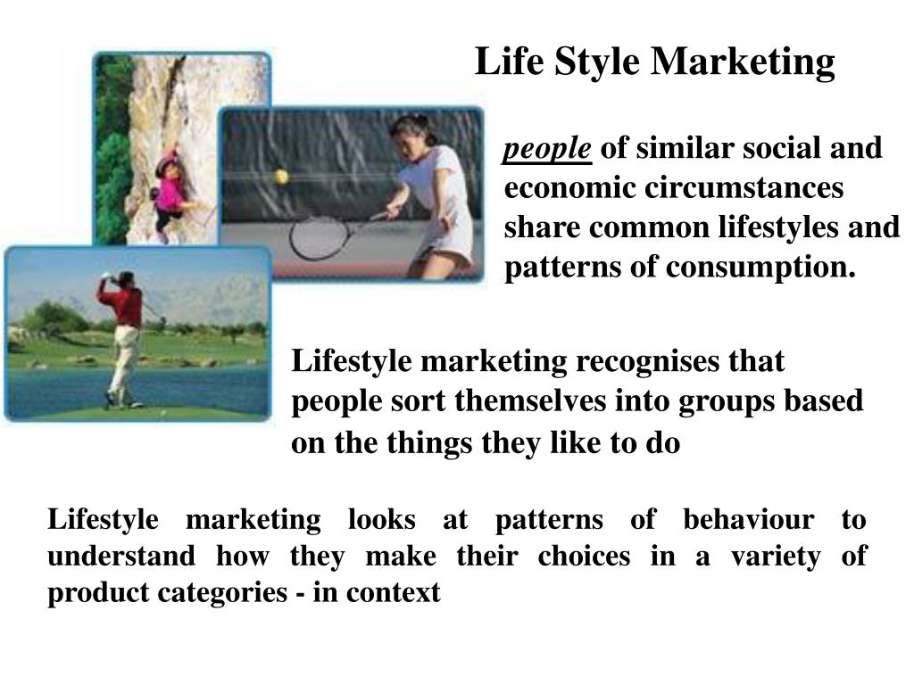 Life Style Marketing people of similar social and economic circumstances share common lifestyles and patterns of consumption. Lifestyle marketing recognises that people sort themselves into groups based on the things they like to do Lifestyle marketing looks at patterns of behaviour to understand how they make their choices in a variety of product categories - in context
