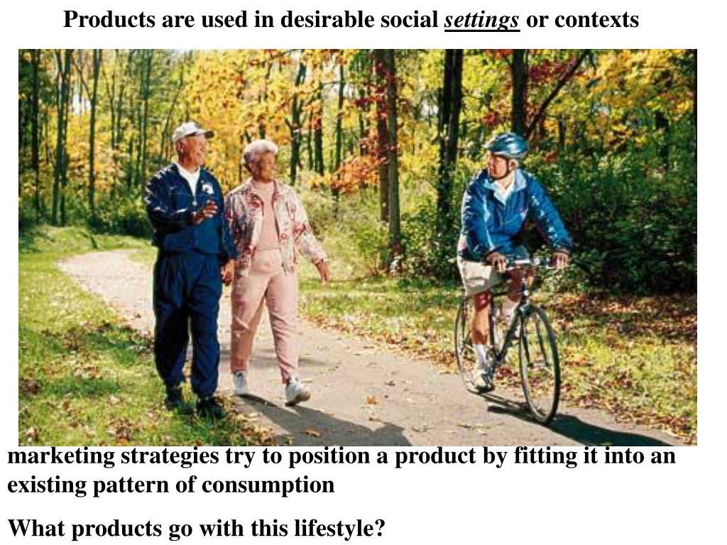 Products are used in desirable social settings or contexts marketing strategies try to position a product by fitting it into an existing pattern of consumption What products go with this lifestyle?