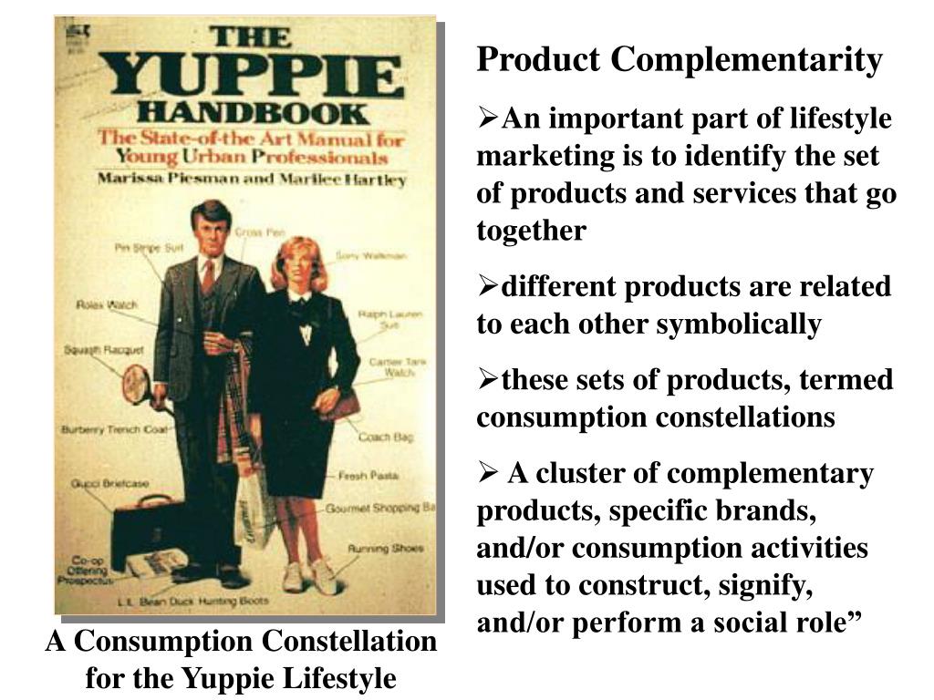 Product Complementarity • An important part of lifestyle marketing is to identify the set of products and services that go together • different products are related to each other symbolically • these sets of products, termed consumption constellations • A cluster of complementary products, specific brands, and/or consumption activities used to construct, signify, and/or perform a social role” A Consumption Constellation for the Yuppie Lifestyle