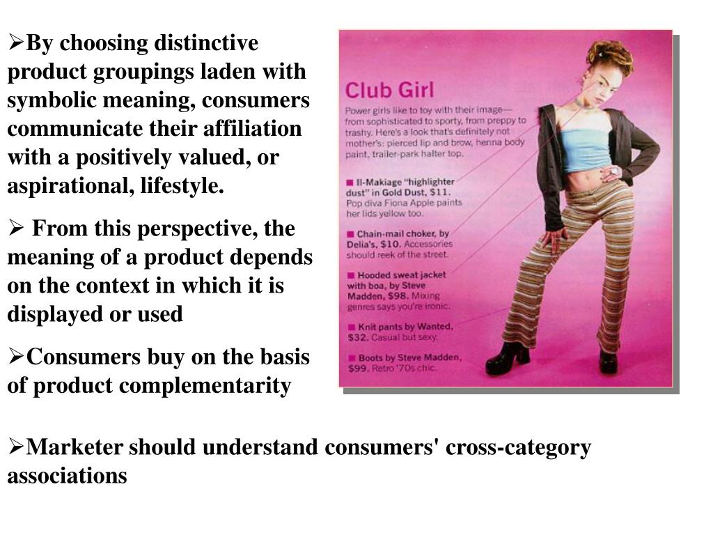 By choosing distinctive product groupings laden with symbolic meaning, consumers communicate their affiliation with a positively valued, or aspirational, lifestyle. • From this perspective, the meaning of a product depends on the context in which it is displayed or used • Consumers buy on the basis of product complementarity • Marketer should understand consumers' cross-category associations