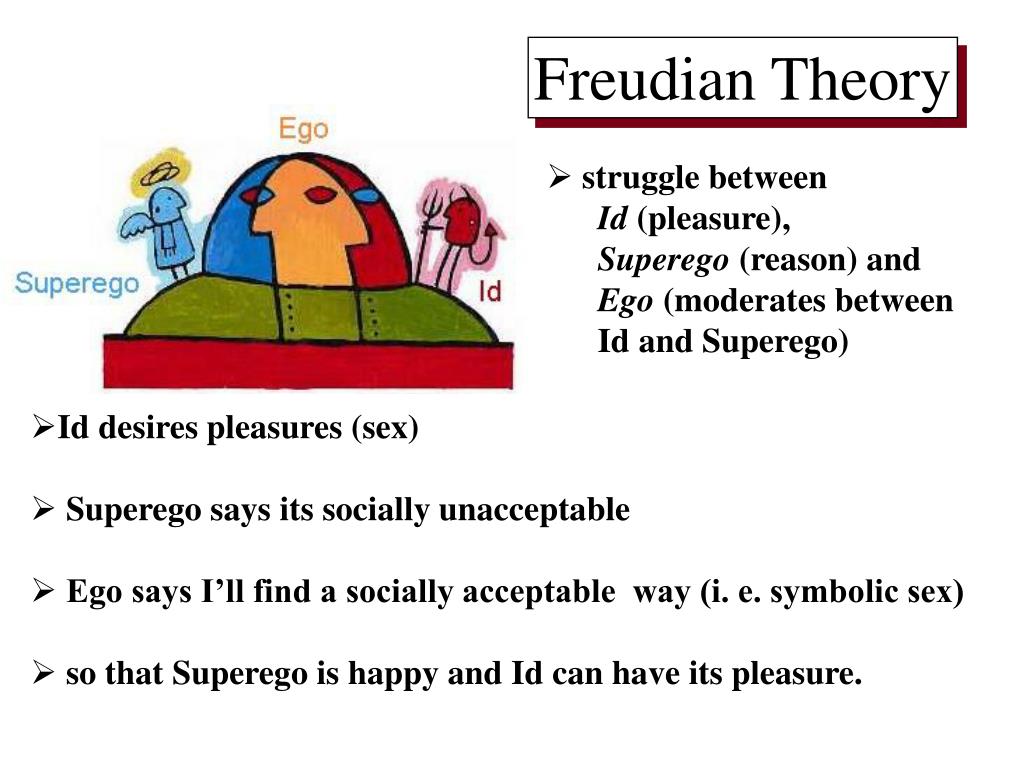 Freudian Theory • struggle between Id (pleasure), Superego (reason) and Ego (moderates between Id and Superego) • Id desires pleasures (sex) • Superego says its socially unacceptable • Ego says I’ll find a socially acceptable way (i. e. symbolic sex) • so that Superego is happy and Id can have its pleasure.