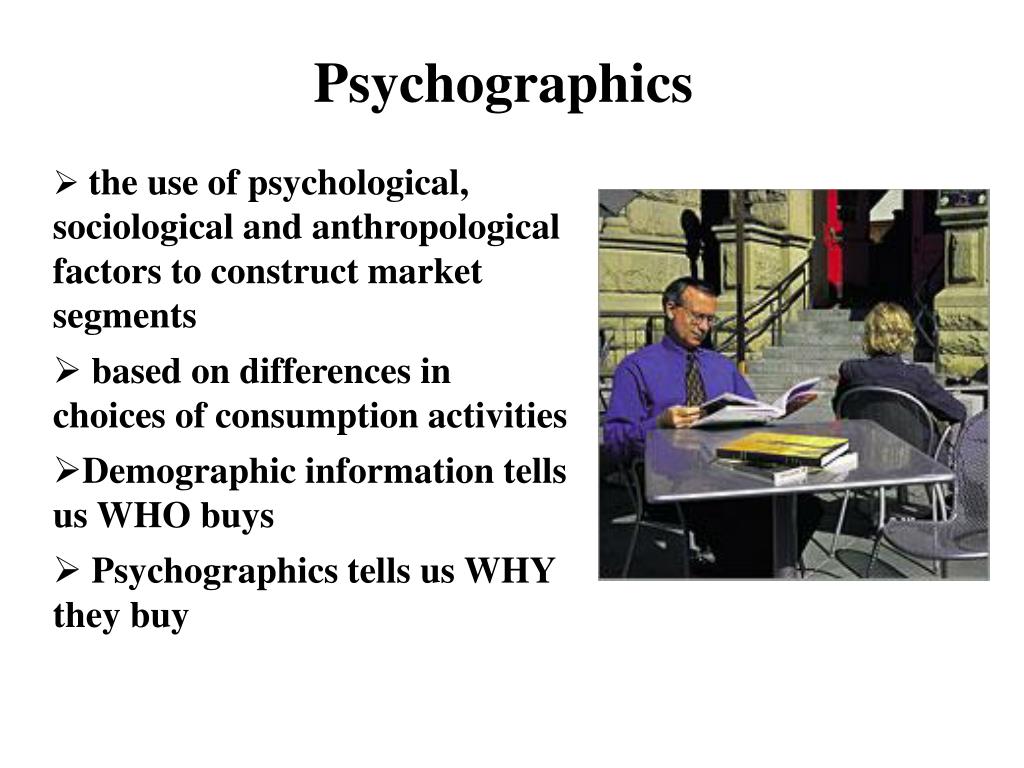 Psychographics • the use of psychological, sociological and anthropological factors to construct market segments • based on differences in choices of consumption activities • Demographic information tells us WHO buys • Psychographics tells us WHY they buy