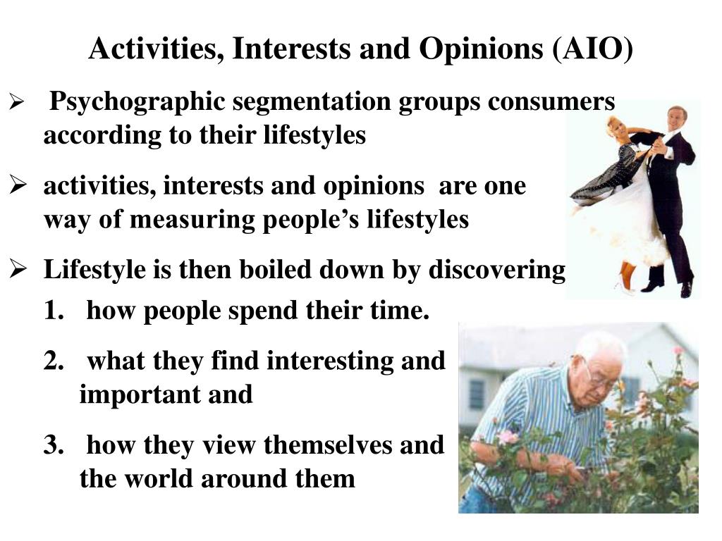 Activities, Interests and Opinions (AIO) • Psychographic segmentation groups consumers according to their lifestyles • activities, interests and opinions are one way of measuring people’s lifestyles • Lifestyle is then boiled down by discovering • how people spend their time. • what they find interesting and important and • how they view themselves and the world around them