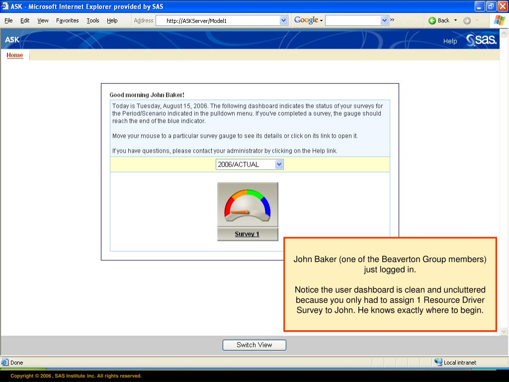 John Baker (one of the Beaverton Group members) just logged in. Notice the user dashboard is clean and uncluttered because you only had to assign 1 Resource Driver Survey to John. He knows exactly where to begin.