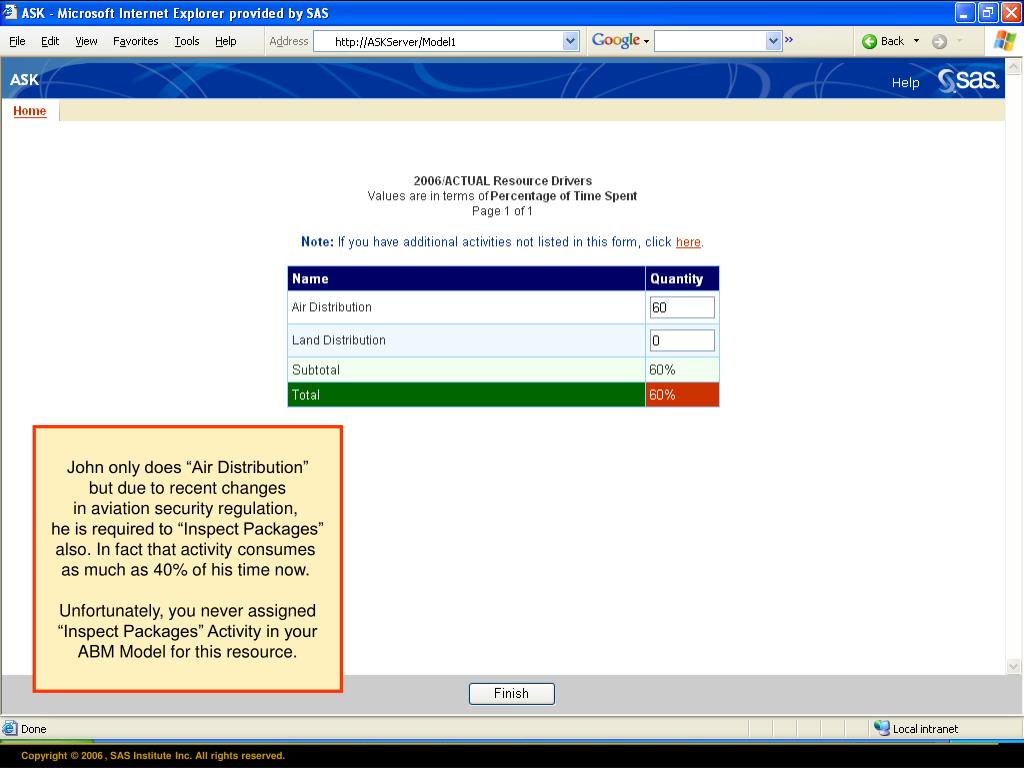 John only does “Air Distribution” but due to recent changes in aviation security regulation, he is required to “Inspect Packages” also. In fact that activity consumes as much as 40% of his time now. Unfortunately, you never assigned “Inspect Packages” Activity in your ABM Model for this resource.