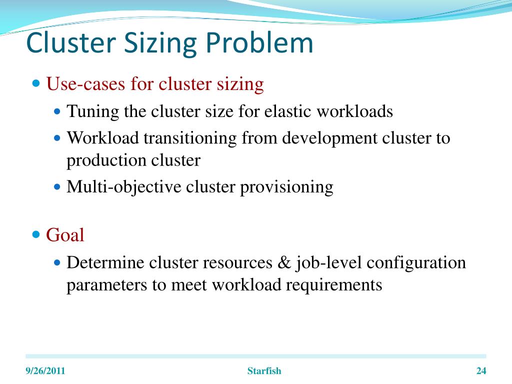 Cluster Sizing Problem • Use-cases for cluster sizing • Tuning the cluster size for elastic workloads • Workload transitioning from development cluster to production cluster • Multi-objective cluster provisioning • Goal • Determine cluster resources & job-level configuration parameters to meet workload requirements Starfish