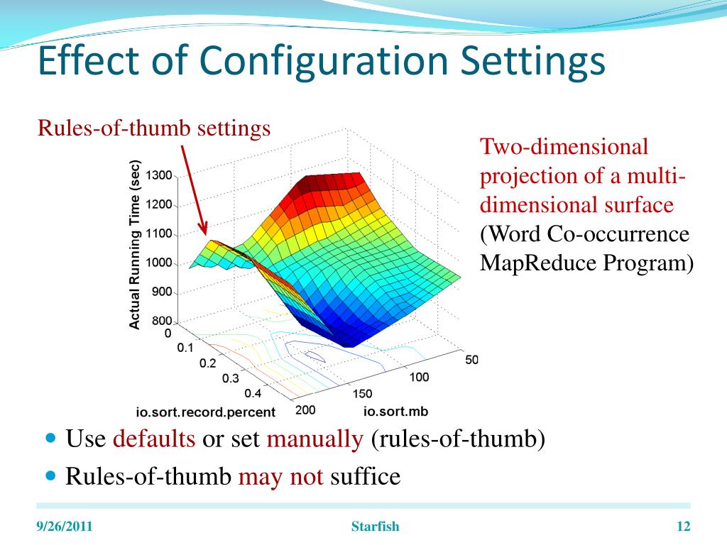 Effect of Configuration Settings • Use defaults or set manually (rules-of-thumb) • Rules-of-thumb may not suffice Rules-of-thumb settings Two-dimensional projection of a multi-dimensional surface (Word Co-occurrence MapReduce Program) Starfish