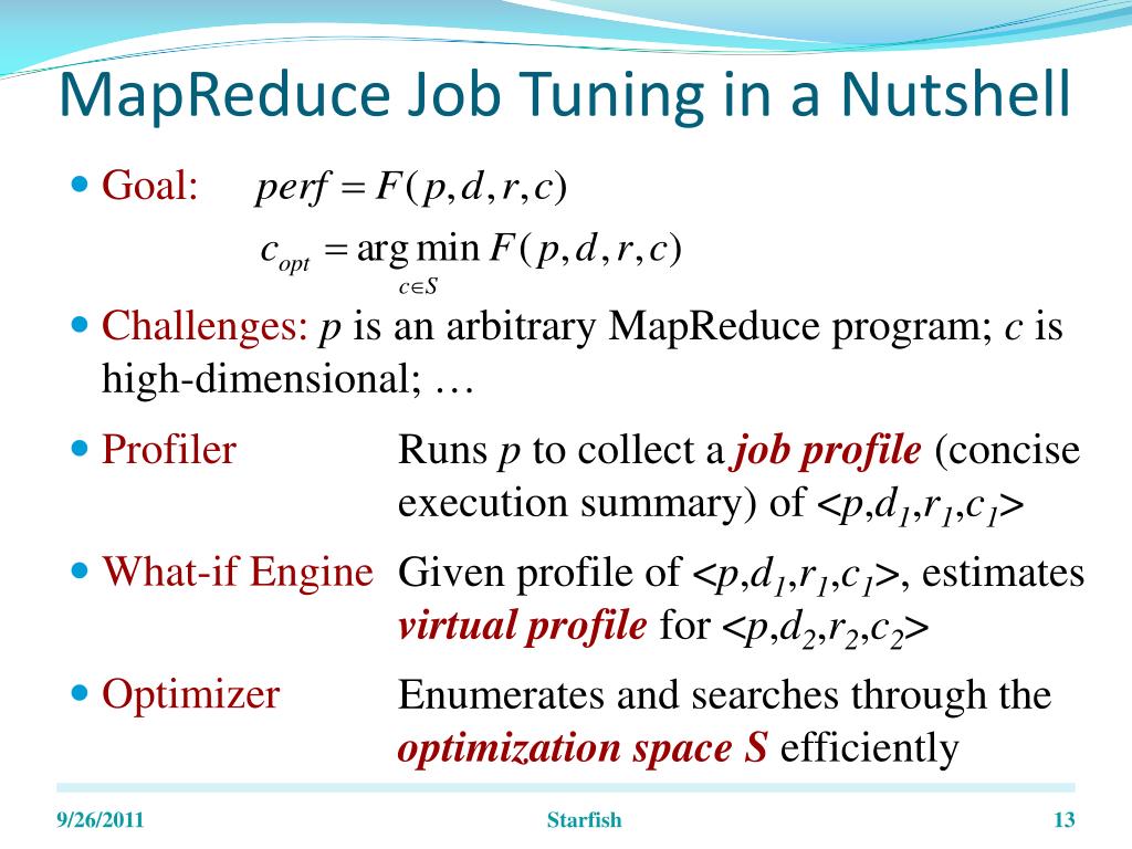 MapReduce Job Tuning in a Nutshell • Goal: • Challenges:p is an arbitrary MapReduce program; c is high-dimensional; … Runs p to collect a job profile (concise execution summary) of <p,d1,r1,c1> • Profiler • What-if Engine • Optimizer Given profile of <p,d1,r1,c1>, estimates virtual profile for <p,d2,r2,c2> Enumerates and searches through the optimization space S efficiently Starfish