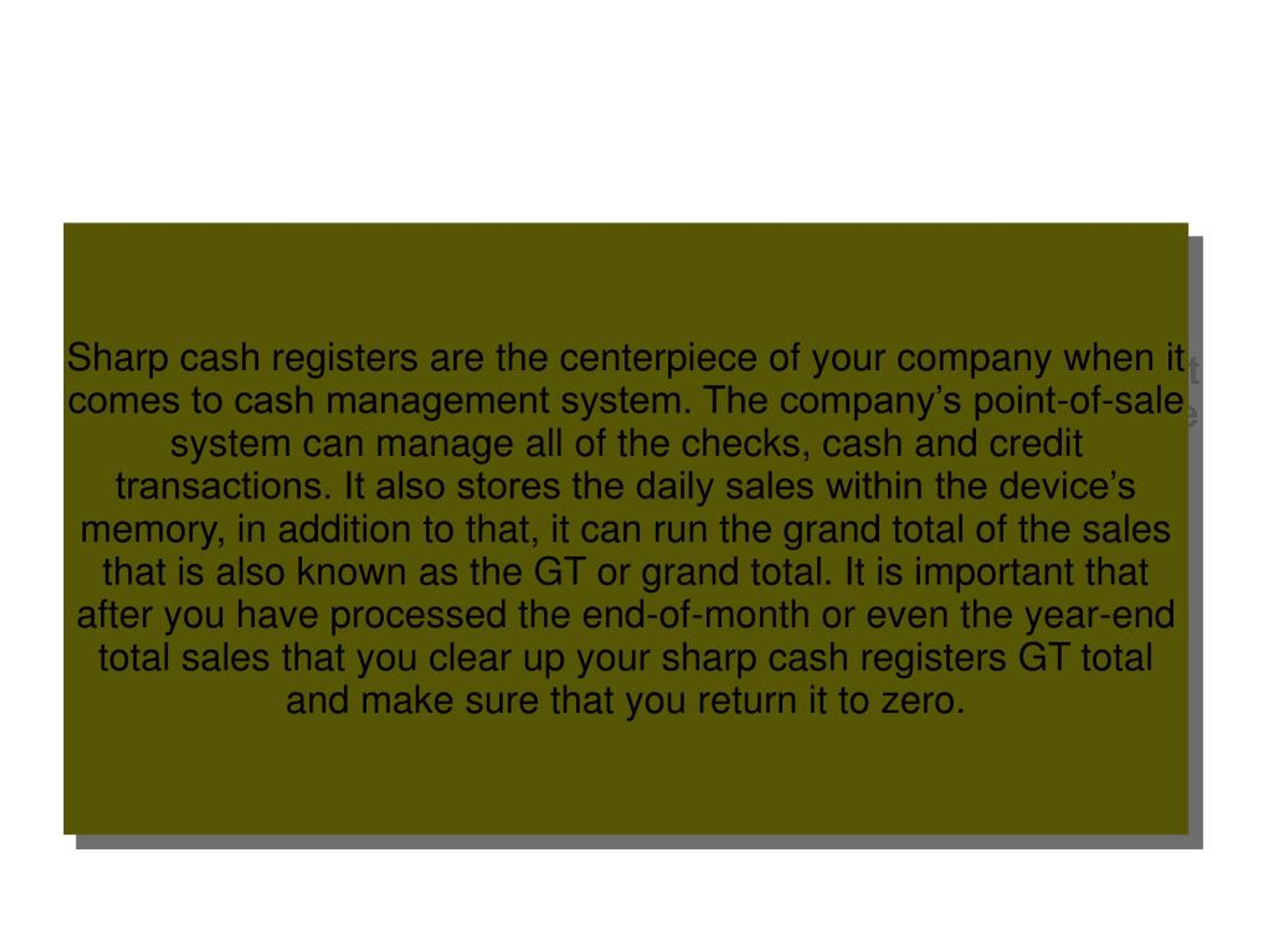 Sharp cash registers are the centerpiece of your company when it comes to cash management system. The company’s point-of-sale system can manage all of the checks, cash and credit transactions. It also stores the daily sales within the device’s memory, in addition to that, it can run the grand total of the sales that is also known as the GT or grand total. It is important that after you have processed the end-of-month or even the year-end total sales that you clear up your sharp cash registers GT total and make sure that you return it to zero.