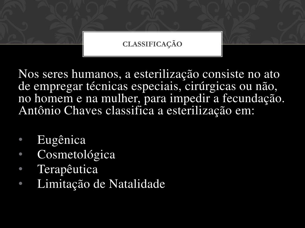classificação • Nos seres humanos, a esterilização consiste no ato de empregar técnicas especiais, cirúrgicas ou não, no homem e na mulher, para impedir a fecundação. Antônio Chaves classifica a esterilização em: • Eugênica • Cosmetológica • Terapêutica • Limitação de Natalidade