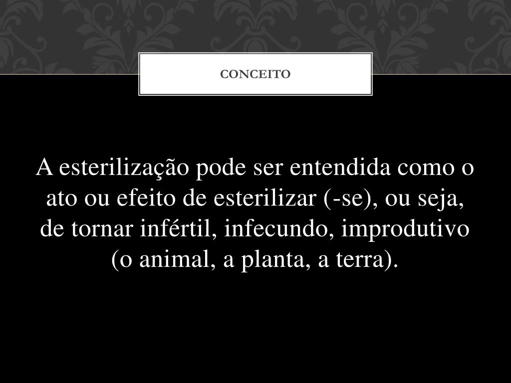 conceito • A esterilização pode ser entendida como o ato ou efeito de esterilizar (-se), ou seja, de tornar infértil, infecundo, improdutivo (o animal, a planta, a terra).