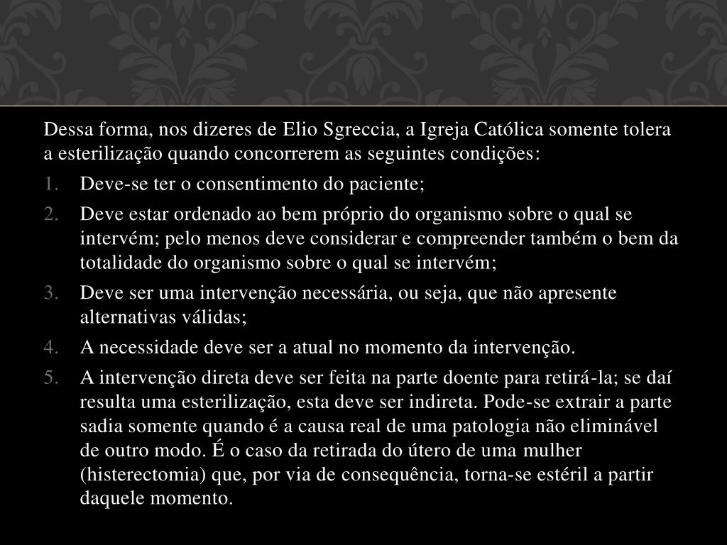 Dessa forma, nos dizeres de ElioSgreccia, a Igreja Católica somente tolera a esterilização quando concorrerem as seguintes condições: • Deve-se ter o consentimento do paciente; • Deve estar ordenado ao bem próprio do organismo sobre o qual se intervém; pelo menos deve considerar e compreender também o bem da totalidade do organismo sobre o qual se intervém; • Deve ser uma intervenção necessária, ou seja, que não apresente alternativas válidas; • A necessidade deve ser a atual no momento da intervenção. • A intervenção direta deve ser feita na parte doente para retirá-la; se daí resulta uma esterilização, esta deve ser indireta. Pode-se extrair a parte sadia somente quando é a causa real de uma patologia não eliminável de outro modo. É o caso da retirada do útero de uma mulher (histerectomia) que, por via de consequência, torna-se estéril a partir daquele momento.