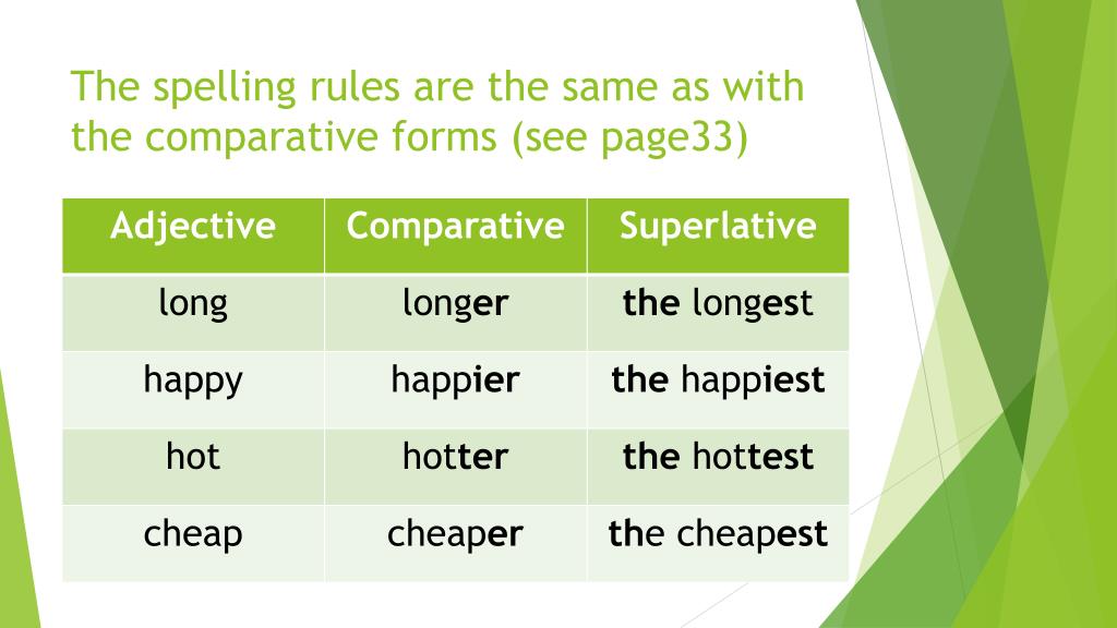 There are two ways of making superlatives of adjectives. • A: the ________________ - est • B. the most • In choosing which form of the superlative to use, we follow the same rules as with comparatives.
