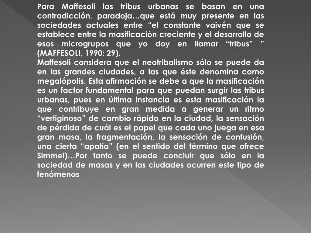 Para Maffesoli las tribus urbanas se basan en una contradicción, paradoja…que está muy presente en las sociedades actuales entre “el constante vaivén que se establece entre la masificación creciente y el desarrollo de esos microgrupos que yo doy en llamar “tribus” ” (MAFFESOLI, 1990; 29). Maffesoli considera que el neotribalismo sólo se puede da en las grandes ciudades, a las que éste denomina como megalópolis. Esta afirmación se debe a que la masificación es un factor fundamental para que puedan surgir las tribus urbanas, pues en última instancia es esta masificación la que contribuye en gran medida a generar un ritmo “vertiginoso” de cambio rápido en la ciudad, la sensación de pérdida de cuál es el papel que cada uno juega en esa gran masa, la fragmentación, la sensación de confusión, una cierta “apatía” (en el sentido del término que ofrece Simmel)…Por tanto se puede concluir que sólo en la sociedad de masas y en las ciudades ocurren este tipo de fenómenos