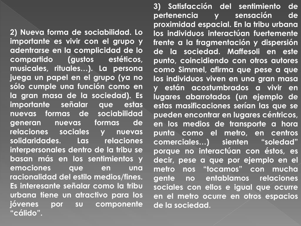 3) Satisfacción del sentimiento de pertenencia y sensación de proximidad espacial. En la tribu urbana los individuos interactúan fuertemente frente a la fragmentación y dispersión de la sociedad. Maffesoli en este punto, coincidiendo con otros autores como Simmel, afirma que pese a que los individuos viven en una gran masa y están acostumbrados a vivir en lugares abarrotados (un ejemplo de estas masificaciones serían las que se pueden encontrar en lugares céntricos, en los medios de transporte a hora punta como el metro, en centros comerciales…) sienten “soledad” porque no interactúan con éstos, es decir, pese a que por ejemplo en el metro nos “tocamos” con mucha gente no entablamos relaciones sociales con ellos e igual que ocurre en el metro ocurre en otros espacios de la sociedad. 2) Nueva forma de sociabilidad. Lo importante es vivir con el grupo y adentrarse en la complicidad de lo compartido (gustos estéticos, musicales, rituales…). La persona juega un papel en el grupo (ya no sólo cumple una función como en la gran masa de la sociedad). Es importante señalar que estas nuevas formas de sociabilidad generan nuevas formas de relaciones sociales y nuevas solidaridades. Las relaciones interpersonales dentro de la tribu se basan más en los sentimientos y emociones que en una racionalidad del estilo medios/fines. Es interesante señalar como la tribu urbana tiene un atractivo para los jóvenes por su componente “cálido”.