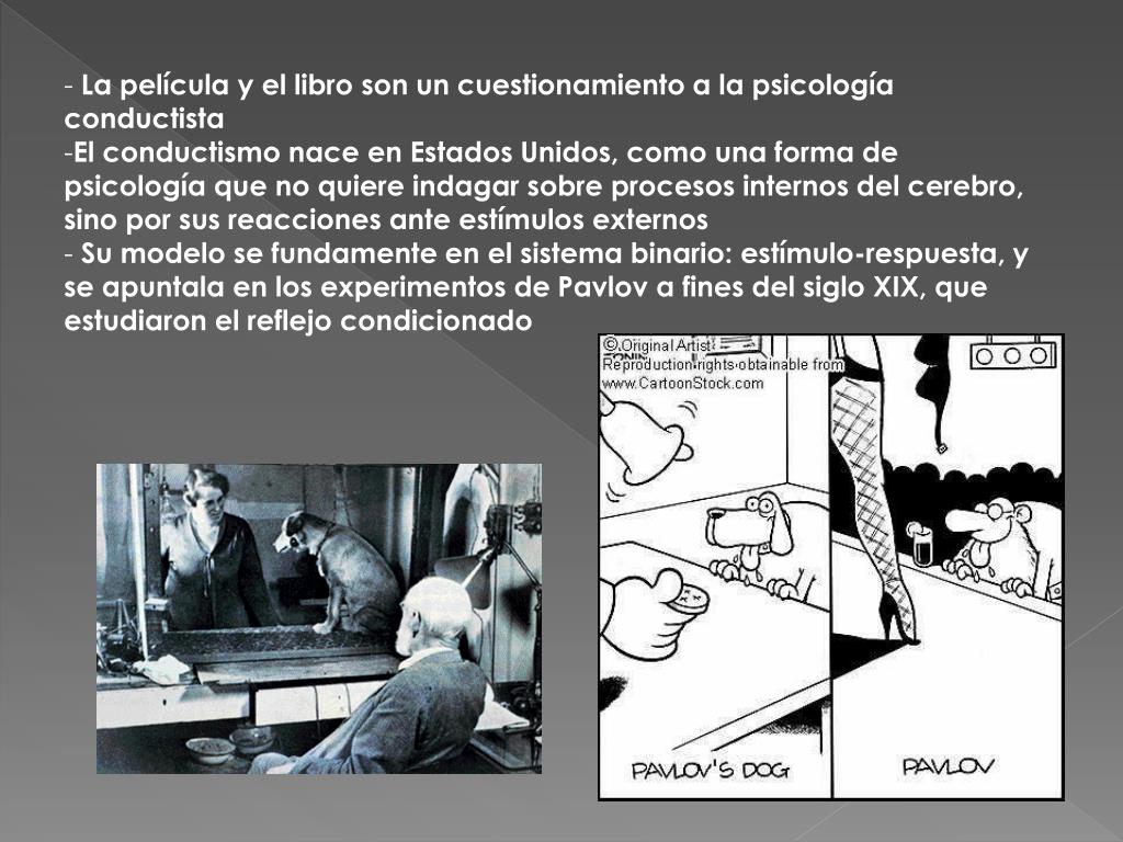 La película y el libro son un cuestionamiento a la psicología conductista • El conductismo nace en Estados Unidos, como una forma de psicología que no quiere indagar sobre procesos internos del cerebro, sino por sus reacciones ante estímulos externos • Su modelo se fundamente en el sistema binario: estímulo-respuesta, y se apuntala en los experimentos de Pavlov a fines del siglo XIX, que estudiaron el reflejo condicionado