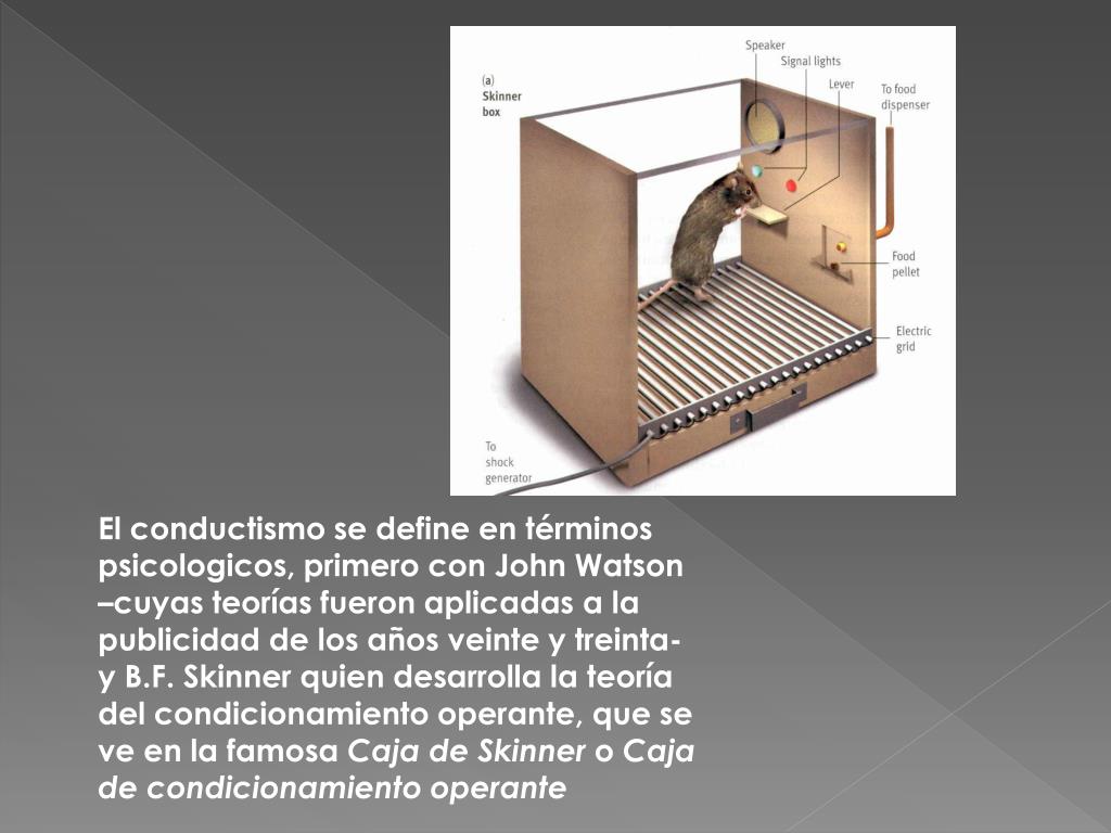 El conductismo se define en términos psicologicos, primero con John Watson –cuyas teorías fueron aplicadas a la publicidad de los años veinte y treinta- y B.F. Skinner quien desarrolla la teoría del condicionamiento operante, que se ve en la famosa Caja de Skinnero Caja de condicionamiento operante